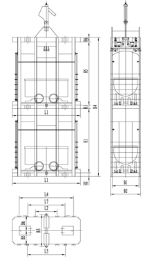 立井單繩罐籠由楔形連接裝置,抓捕器、罐體、罐內(nèi)阻車器、導(dǎo)向裝置組成,如用于上下人,則必須設(shè)置斷繩保險(xiǎn)器(防墜器),抓捕器根據(jù)制動(dòng)繩布置形式可分為I型(對(duì)稱)抓捕和II型(對(duì)角)抓捕形式。常用單繩罐籠及配套防墜器的具體型號(hào)參數(shù)見附表。